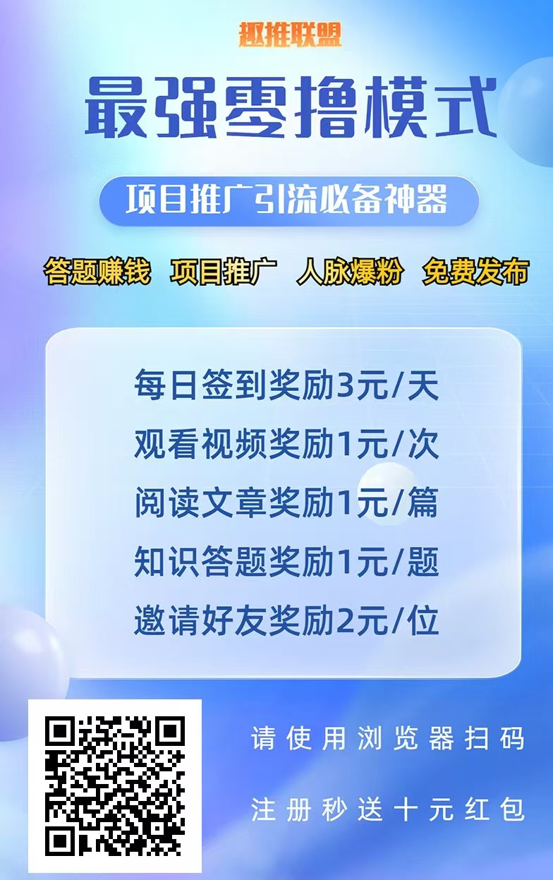 刚出首码趣推联盟广告引流平台火爆进行中,新模式,新平台,新流量,每天几十万流量聚集,最大亮点在于:可享有独立分站使用权,每日转盘抽奖最高可得888元红包,佣金可得高达60%,平台消费打五折,可引流可推广好上人,快来下载试试吧!